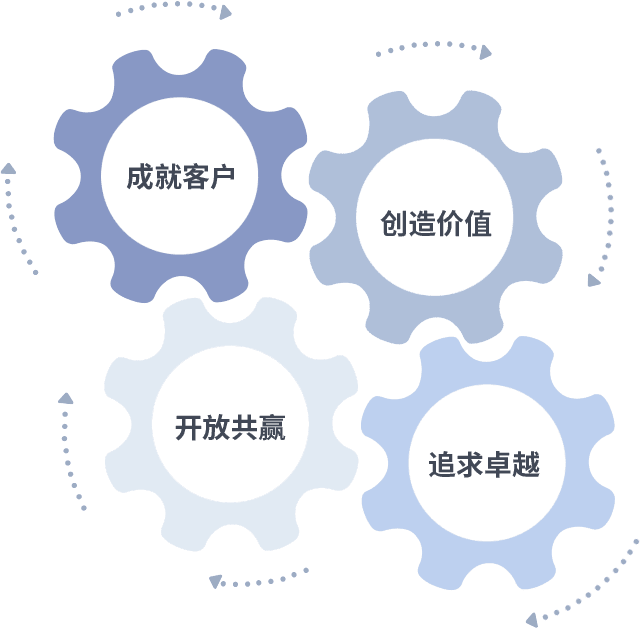 成就客户是一切决策的出发点,,,,创造价值是衡量所有工作的标准,,追求卓越是我们做事做人的态度,,,开放共赢是我们的格局也是最终的结果。。。。价值观的齿轮环环相扣,,,,推动着组织里的每个人不断向前。。